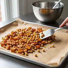 Spread the seasoned pumpkin and chickpeas on the prepared baking sheet lined with parchment paper. Make sure the ingredients form a single layer and do not overlap – this will ensure they stay crispy. Place the baking sheet in the preheated oven and bake for 25-30 minutes. Halfway through baking (after about 15 minutes), stir the vegetables with a spatula. The pumpkin should be soft and slightly caramelized at the edges, and the chickpeas golden and crispy.