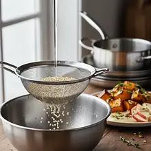 While the vegetables are baking, cook the quinoa. Place the quinoa in a fine sieve and rinse thoroughly under cold running water, rubbing the grains with your hands for about 30 seconds. This step removes saponins, a natural coating that can give a bitter taste. Transfer the rinsed quinoa to a small pot, add 200 ml of cold water and 1 pinch of salt. Bring to a boil, then reduce the heat to the minimum, cover the pot, and cook for about 15 minutes, until all the water is absorbed. Remove the pot from the heat and let it sit covered for another 5 minutes. Finally, gently 'fluff' the quinoa with a fork to separate the grains.