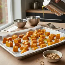 Line a large baking sheet with parchment paper. Spread the pumpkin pieces in a single layer on it. Drizzle with one tablespoon of olive oil, sprinkle with a pinch of salt and pepper. Mix thoroughly with your hands to ensure each piece is coated with oil and seasonings. Place the baking sheet in the preheated oven and bake for 20-25 minutes, until the pumpkin is tender (check by piercing with a fork – it should go in easily) and slightly browned at the edges.