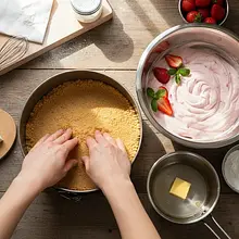 Melt the butter in a small saucepan over low heat or in the microwave. Be careful not to burn it. Transfer the crushed biscuits to a bowl, pour in the melted butter, and mix thoroughly with a spoon until all the crumbs are moist and the mixture resembles wet sand.