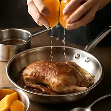 Traditional duck with oranges is an exquisite main dish that combines juicy, roasted meat with an intense, sweet-and-sour orange-honey glaze. This dish is perfect for New Year's Eve 2025 or other festive occasions — it makes a visual impression with its golden, crispy skin and glossy glaze, while the flavor blends the aromatic duck fat, citrus freshness, and a delicate hint of wine and balsamic. Serve with roasted potatoes or celery puree and wine to drink; it looks great on a large platter with orange slices and fresh parsley.