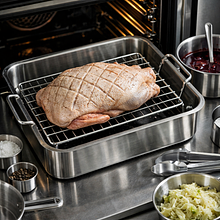 Preheat the oven to 220°C (top-bottom). Place the duck breast side up on a rack set over a deep baking tray (the tray will catch the dripping fat). Insert a thermometer into the thickest part of the thigh, avoiding the bone. Put the duck in for 20 minutes at 220°C to crisp the skin and allow some fat to render.