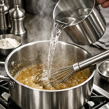 Reduce the heat to medium. Add the flour to the sautéed vegetables and stir vigorously for 1-2 minutes, until the flour lightly combines and starts to smell nutty — this will remove the raw taste of the flour. If you are using butter, add it now and mix it with the flour instead of part of the oil. The roux should be light brown and lump-free.