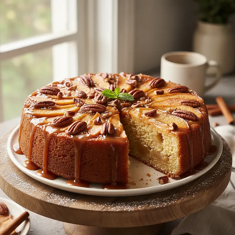 Here is a cake that is the essence of autumn and culinary magic – Caramel Apple Upside-Down Cake with Pecans. This is not an ordinary apple pie. It is a spectacular combination of French classic Tarte Tatin with the fluffiness and aroma of Polish apple cake. At the bottom of the pan, we create a shiny, amber layer of buttery caramel, in which crunchy pecans are submerged. On top of this, we tightly arrange slices of apples that soften and caramelize while baking, absorbing the sweetness and aroma. The whole is covered with a delicate, fluffy sponge cake, fragrant with cinnamon and vanilla. After baking, there comes the moment of climactic tension – we flip the cake upside down, revealing a shiny, caramel-fruit mosaic. Serve it warm, definitely with a scoop of vanilla ice cream or a dollop of thick sour cream, which will perfectly balance the sweetness of the caramel. This is a cake that not only tastes heavenly but also looks stunning, becoming the star of any table.
