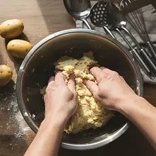 Now knead all the ingredients in a bowl into a smooth, elastic dough. Do this quickly and efficiently – potato dough does not like long kneading. The finished dough should be uniform and not stick too much to your hands. Tear off small pieces of dough and form them into balls the size of a walnut (about 3-4 cm in diameter) in your hands. Slightly flatten each ball, and then use your thumb to make a characteristic indentation in the center – a 'dimple'. Place the finished dumplings on a work surface or board lightly dusted with potato flour.