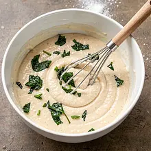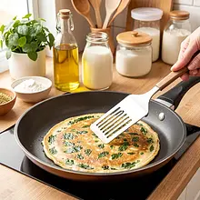 In a large bowl, sift the flour and baking powder. Add a pinch of salt. In a separate container, crack the eggs and lightly beat them with a fork, then pour in the milk and mix. Make a well in the flour, pour in half of the egg-milk mixture, and stir with a spoon from the center towards the edges until a thick batter forms. Add the remaining liquid if the batter is too thick. Finally, fold in the finely chopped remaining sorrel. The batter should have the consistency of thick cream — it should flow easily from the spoon but not be completely runny.