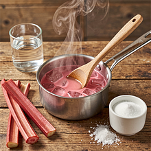 If you are using rhubarb: wash the rhubarb stalks and cut them into 1-2 cm pieces. In a small saucepan, place the chopped rhubarb, 40 g of sugar, and 50 ml of water. Set over medium heat and warm, stirring with a wooden spoon, until the sugar dissolves and the rhubarb begins to break down (about 6-8 minutes). Reduce the heat and cook for 3-4 minutes until the mixture is thick and glossy. Strain through a sieve to separate the pulp — you will get a light pink syrup.