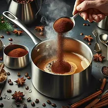 After 5 minutes, add 40 g of ground coffee to the saucepan. Stir vigorously with a spoon to ensure the coffee blends well with the spiced water. Raise the temperature to a gentle boil and cook for 3–4 minutes on very low heat — just lightly bubbling, not vigorously. Monitor the aroma: after 3 minutes, the coffee should have an intense scent, and the brew should be dark and rich.
