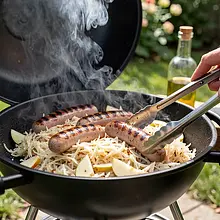 A classic Polish grilled dish transformed into a simple, homemade dinner: juicy pork sausage with crispy, slightly sweet and sour sauerkraut combined with sautéed onions and apple. The dish combines the richness and smoky aroma of the sausage with the acidity of the cabbage and the sweetness of the apple, complemented by marjoram and mustard. Perfect for May grilling, family gatherings, and a quick dinner — serve with young potatoes or fresh bread. Vibrant colors: golden-brown sausage against the creamy cabbage with a green touch of fresh dill or parsley.