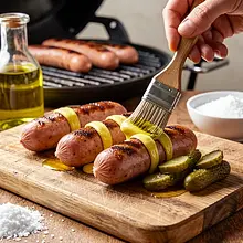 Gently brush the sausage with rapeseed oil, evenly on all sides. Lightly sprinkle with salt (remember that the pickled cucumber is salty). Hold the sausage on the board to allow the oil to spread over the surface.
