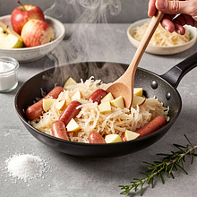 Prepare the ingredients: slice the sausage into pieces about 1–1.5 cm thick. Peel the onion and cut it into large cubes or half-moons. Peel the apple and grate it on a coarse grater or chop it finely. Transfer the sauerkraut to a sieve and, if it is very sour, rinse it briefly under cold water, then squeeze it well to remove excess liquid.