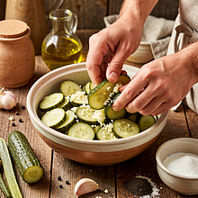 Slice the cucumbers: place the cucumber on the cutting board, holding it steady with one hand, and use the other hand to cut even slices about 4–6 mm thick (thin slices are crunchy, while thicker ones hold the texture of the horseradish better). Cutting even slices will make it easier to eat and will look nice on the plate.