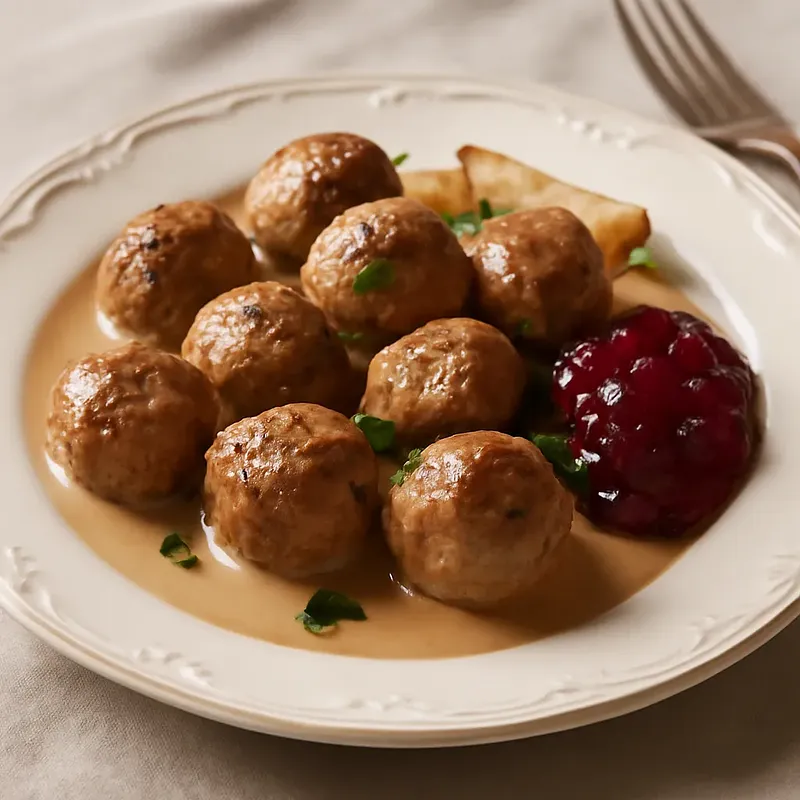 Famous Swedish meatballs - small meatballs in a creamy sauce. A mix of pork and beef with a hint of nutmeg, served with a brown roux sauce, lingonberries, and mashed potatoes. A dish known from IKEA, but true homemade köttbullar are in a completely different league. Tender, aromatic, and irresistibly delicious - the taste of Scandinavian warmth.