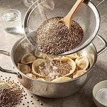 Rinse the dry buckwheat under cold running water in a colander until the water runs clear. Transfer the buckwheat to a medium pot, add 600 ml of water and 2 g of salt (from the salt pool). Place over medium heat, bring to a boil uncovered, then reduce the heat to low so that the water barely simmers. Cover and cook for 12-15 minutes, until the water is absorbed. After cooking, remove the lid and let it sit for 5 minutes, then fluff the buckwheat with a fork - the grains should be loose and separated.