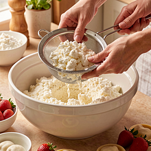 Prepare the cottage cheese: if it is very wet, drain it in a sieve for 10–15 minutes or press it through a fine sieve/potato ricer. If you want to avoid lumps, pass the cottage cheese through a sieve or grind it in a meat grinder. Place the drained cottage cheese in a large bowl.