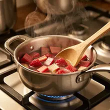 After cooking, remove the saucepan from the heat and let the rhubarb cool for about 10-15 minutes. If you want to speed up the cooling process, transfer the rhubarb to a flat plate and spread it out in a thin layer, or place the saucepan in a larger bowl of cold water.