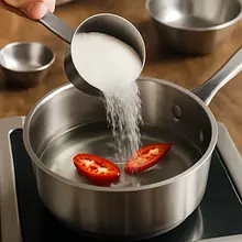 Prepare the chili simple syrup: in a small saucepan, combine 100 g of sugar and 100 ml of water. Add all the sugar, pour in the water, and place over low heat. Stir with a wooden spoon until the sugar is completely dissolved (about 2-3 minutes).