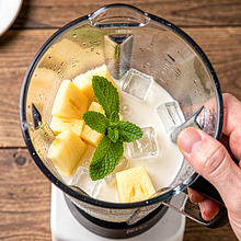 Into the blender, place the chopped pineapple (set aside some for decoration), add coconut milk, freshly squeezed lime juice, and honey. Add the mint leaves — half a bunch — and ice. If you want a lighter consistency, add 100–200 ml of coconut water (optional).