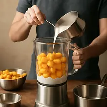 Blend on high speed for 30–45 seconds until the mixture is smooth and homogeneous, with no detectable pieces of mango or large ice crystals. After opening the lid, check the consistency: the smoothie should be creamy and slightly thick, but not too thick — if it is too thick, add 20 ml of water or coconut milk and blend again for 10 seconds.