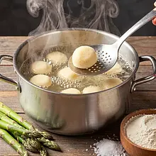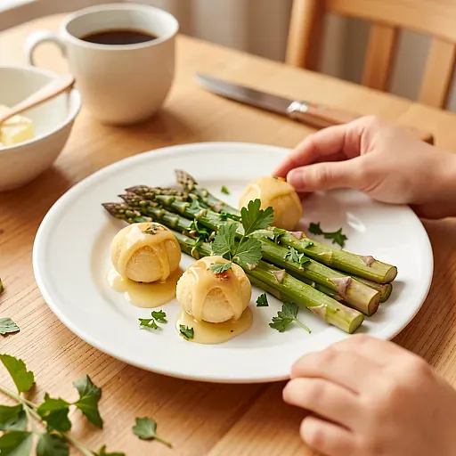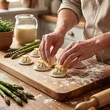 Delicate, small potato dumplings in Silesian, homemade style served with melted butter and young, spring asparagus. This is a light, colorful breakfast option for children: the dumplings are soft and easy to chew, while the green asparagus adds crunch and vitamins. The dish combines the simplicity of Silesian cuisine with a spring touch of seasonal products and can be served with chopped parsley, sorrel for a tangy contrast, or grated cheese for a milder flavor.