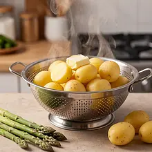 Cook the potatoes over medium heat for 15-20 minutes from the moment of boiling, until they are soft inside - check with a fork: it should easily go in, and the potato should break apart slightly. Drain the potatoes and set them aside in a colander for 2 minutes to allow any excess water to evaporate.