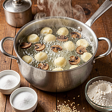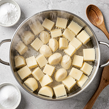 Prepare the potatoes: peel the potatoes and cut them into equal pieces (about 3-4 cm). Place them in a pot, cover with cold water so that the water covers the potatoes by about 1-2 cm. Add 2 g of salt (a small pinch). Bring to a boil over high heat, then reduce the heat and cook for about 20-25 minutes, until the potatoes are soft — you can check this by inserting a fork into the largest piece; the fork should go in smoothly, and the potato should not resist.