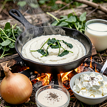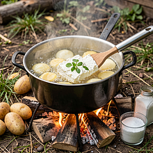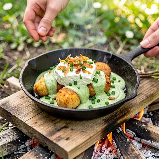 Traditional kopytka prepared over a campfire, enriched with creamy twaróg and fresh sorrel — a spring twist on a Polish classic. Kopytka are made from mashed, drained potatoes and flour, shaped into rolls and cooked in water heated over the fire; they can then be briefly sautéed in a cast-iron skillet over the coals to achieve a golden crust. The sauce is made from delicate twaróg mixed with sour cream, sautéed onions, and chopped sorrel, providing a fresh, slightly sour contrast to the meaty texture of the kopytka. The dish pairs wonderfully with smoked bacon as an optional addition or with parsley for freshness. This hearty, rustic dish is perfect for a May Day celebration, camping, or a family meal outdoors — aromatic, visually appealing (golden kopytka and green sauce), and easy to transport to a field kitchen.