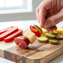 Assembling the skewers: take a toothpick and pierce the ingredients in the following order — a piece of kabanos (you can slightly twist it into a spiral if it's long), a cube of bell pepper, a cube of cheese, and a half slice of pickled cucumber at the end. Insert the toothpick centrally through each ingredient, leaving about 1 cm of the toothpick free at the top for holding. Do not place the ingredients too close to the edge to prevent them from falling apart. Repeat the process to create 12 skewers.