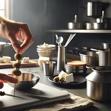 Skewering the appetizers: take a stick and skewer the ingredients in the following order: first an olive (piercing its side, not the center, to maintain its shape), then a cube of cheese (piercing halfway up the cube), and finally a slice of gherkin. Leave about 1 cm of the stick free at the end so that the appetizer can be easily picked up. Form all the appetizers in the same way. Aim for a pace of about 15–25 seconds per appetizer, meaning that making 24 appetizers will take 6–10 minutes.