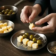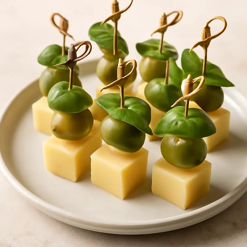 Assembling the skewers (the most important step). At the end of the toothpick, start: first, thread a cube of cheese (piercing the center of the cube to prevent it from crumbling at the edge), then an olive (whole), optionally half a cherry tomato with the flat side facing inward, and finally a folded basil leaf. If you want, you can change the order: cheese-olive-tomato is stable. Assemble in sequence until you have 24 skewers. Estimated assembly time: 20-30 minutes (about 40-70 seconds per skewer).