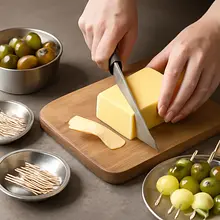 Take a piece of yellow cheese weighing about 240 g. Place it on a cutting board and first cut off a thin layer of rind if it is too hard. Then slice the cheese into pieces about 1.5 cm thick. Stack the slices on top of each other and cut them into strips about 1.5 cm wide, then turn and cut into cubes. Each cube should weigh approximately 10 g (about 1.5–2 cm on each side) — these will be convenient portions for a toothpick. If the cubes are uneven, adjust them while skewering so that the appetizers are stable.