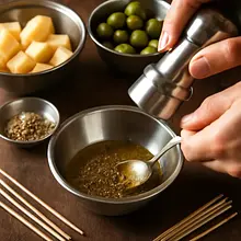 In a small bowl, mix olive oil (30 g = 2 tablespoons) with dried oregano (2 g = 1 teaspoon), pepper (1 g pinch), and a very small amount of salt (1 g pinch) — stir with a fork for 20-30 seconds until the ingredients are combined. Taste the marinade gently on a clean spoon — remember that olives are salty, so avoid adding too much salt.