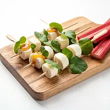 On toothpicks, thread in the following order: a piece of cheese about 2 cm on each side (shaped with a spoon), a leaf of sorrel folded in half, and a piece of rhubarb. If the cheese crumbles, wet your hands with cold water before shaping the small cubes. Arrange the skewers on a flat tray lined with baking paper.