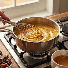 Postaw rondelek z masą dyniową na małym ogniu. Podgrzewaj, ciągle mieszając trzepaczką, przez około 3-4 minuty, aż masa będzie gorąca i zaczną pojawiać się pierwsze bąbelki na brzegach. Nie doprowadzaj do wrzenia. Gdy masa dyniowa jest już dobrze podgrzana, wlej do niej powoli 400 ml gorącej, zaparzonej wcześniej herbaty, cały czas energicznie mieszając trzepaczką, aby składniki idealnie się połączyły. Podgrzewaj jeszcze przez minutę, po czym zdejmij z ognia.