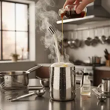 W osobnym, małym naczyniu (np. metalowym kubku do spieniania lub małym rondelku) podgrzej pozostałe 100 ml mleka. Mleko powinno osiągnąć temperaturę około 60-65°C. Jeśli nie masz termometru, podgrzewaj je do momentu, aż będzie bardzo gorące w dotyku, ale jeszcze nie będzie parzyć, a na brzegach zaczną pojawiać się drobne pęcherzyki.