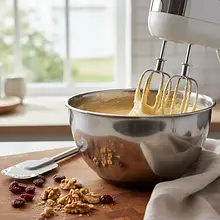 Add the chopped, toasted walnuts and dried cranberries to the prepared mixture. Gently mix them with a spatula, making just a few movements, just enough to distribute them evenly in the batter. Pour the prepared mixture into the previously prepared mold and smooth the top with a spatula.