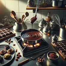 Prepare the glaze: place broken dark chocolate (250 g) in a heatproof bowl. Heat water in a pot to a gentle boil, set the bowl over the pot (double boiler) and stir the chocolate until it melts. When it is almost liquid, add oil (15 g) and stir until you achieve a smooth, shiny consistency. The glaze should be at a temperature of about 30-32°C for coating.