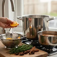 Rozpocznij od przygotowania składników aromatyzujących. Bardzo dokładnie umyj pomarańczę pod bieżącą, ciepłą wodą, szorując ją szczoteczką. Jeśli nie jest to pomarańcza ekologiczna, warto ją dodatkowo sparzyć wrzątkiem. Następnie, za pomocą obieraczki do warzyw, zdejmij z połowy pomarańczy 3-4 długie paski samej pomarańczowej skórki. Staraj się nie zahaczać o białą, wewnętrzną część (albedo), ponieważ jest gorzka. Przekrój pomarańczę na pół i wyciśnij z niej sok do małej miseczki. Jeśli używasz opcjonalnego imbiru, obierz go ze skórki za pomocą małej łyżeczki (skrobanie jest łatwiejsze niż krojenie) i pokrój w cienkie plasterki.