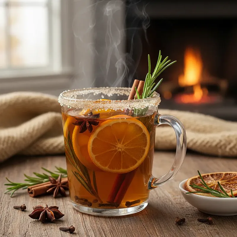 Każdą porcję udekoruj pozostałą świeżą gałązką rozmarynu. Możesz też dodać świeży, niegotowany plasterek pomarańczy do każdej szklanki dla wzmocnienia cytrusowego aromatu. Podawaj natychmiast, póki jest gorący i najbardziej aromatyczny.