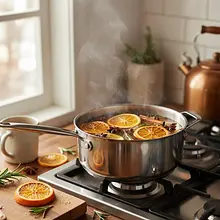 When the mulled wine is hot, reduce the heat to the absolute minimum, so that the drink only gently 'flickers' but does not boil. Cover the pot with a lid, leaving a small gap, and let it steep for about 15-20 minutes. This time will allow the spices to release their full essential oils and flavors, which will infuse into the apple juice.