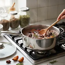 Postaw rondel na małym ogniu i podgrzewaj powoli, często mieszając. Celem jest podgrzanie mieszanki do temperatury około 70-80°C, aby smaki przypraw i ziół przeszły do syropu. Podgrzewaj przez około 15 minut. Płyn powinien być bardzo gorący, ale NIE MOŻE SIĘ ZAGOTOWAĆ. Wrzenie zniszczyłoby delikatne aromaty i sprawiło, że smak octu stałby się zbyt ostry.