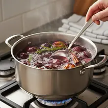Pour the recovered plum syrup into a heavy-bottomed saucepan. Add the apple cider vinegar, the cinnamon stick, and, if using, the star anise. Gently stir everything with a wooden spoon.