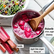 In a small pot, place the chopped rhubarb (about 1-2 cm pieces), a tablespoon of oil (15 g), 1 finely chopped onion (if you want a stronger flavor, use red), sugar, honey, and apple cider vinegar. Bring to a boil over medium heat, then reduce the heat and cook for 10-15 minutes, stirring occasionally, until the rhubarb softens and the sauce thickens to a jam-like consistency.