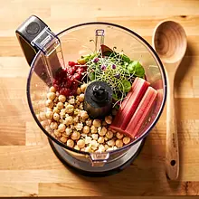 Place the drained chickpeas in a food processor and pulse in short bursts (2-3 times for 1-2 seconds) until the grains are broken down, but not completely into a paste — a light texture should remain. Transfer to a large bowl.