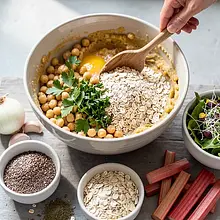 A light and spring-inspired snack influenced by plant-based cuisine: golden chickpea patties served with a slightly sweet and sour rhubarb chutney and a fresh salad of sprouts and sorrel. The dish combines the creamy texture of chickpeas, the nutty hint of oats, and the freshness of sorrel, while the chutney adds a distinctive spring acidity. Perfect as a fit appetizer for New Year's Eve, for a gathering with friends, or as a light lunch. Serve hot patties with a spoonful of chutney and a portion of salad; the visual contrast of colors (pink rhubarb, green sprouts, golden patties) is eye-catching and encourages tasting.
