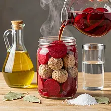 If you are using raw beets: wash them and cook in salted water with the skin on for 40–60 minutes until they are soft (check with a fork). After cooking, cool them under cold water and peel the skin off. Cut the beets into slices or half-moons about 5–7 mm thick. If you already have cooked beets, just slice them and move on.