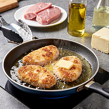 Gently place the cutlets in the heated oil. Fry without moving for 3–4 minutes until the bottom is golden and crispy. Flip the cutlet using tongs or a wide spatula and fry the other side for another 3–4 minutes. At the end of frying, add 20 g of butter to the pan and tilting the pan, baste the cutlets 1–2 times to give them a nice color and aroma.