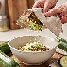 Transfer the grated zucchini to a clean kitchen towel or a piece of cheesecloth and squeeze it tightly. Gather the corners of the towel, twist, and squeeze into a bowl as much as possible — until it stops dripping. The mixture should significantly reduce in volume and be only slightly moist.