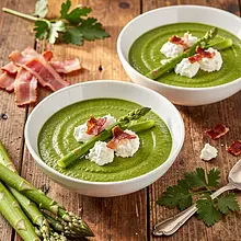 In the hot soup, mix in half of the cooked bacon (save the rest for garnish). Pour the soup into shallow serving bowls. In the center of each portion, place a spoonful of ricotta or form a small dollop using two spoons. Sprinkle the remaining bacon on top along with the sautéed asparagus and finely chopped dill or parsley (optional).