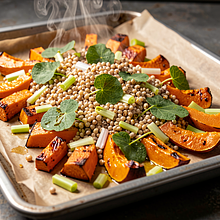 Preheat the oven to 200°C (top-bottom). Cut the pumpkin in half, remove the seeds with a spoon, peel it if using butternut (you can leave the skin on hokkaido) and cut the flesh into 2-3 cm cubes. Peel the onion and slice it into feathers, peel the carrot and cut it into 0.5 cm slices, peel the celery and cut it into cubes. Crush the garlic with the flat side of a knife and leave it in the skins or peel and slice it — roasting will mellow the flavor.